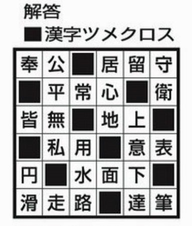 ギャル語で頭の体操をしていただきましたが、今日は毎日新聞のパズル「漢字ツメクロス」にも挑戦してください。答えも掲載します。