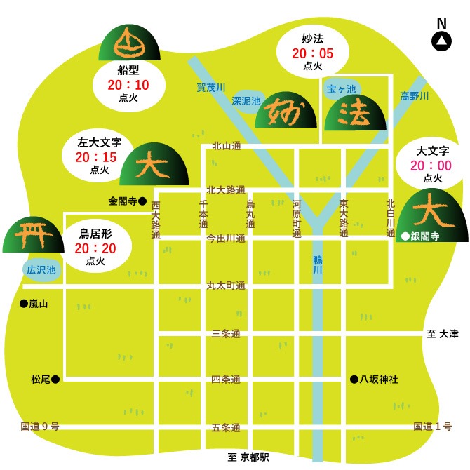 京都の街を囲む5つの山の火床に「大文字(だいもんじ)」「妙法(みょうほう)」「船形(ふながた)」「左大文字(ひだりだいもんじ)」「鳥居形(とりいがた)」の文字や形に送り火を焚く、お盆の代表行事です。願いなどを記した護摩木も一緒に焚き上げられます。