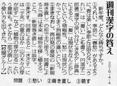 さて、今日4月最初の「週刊漢字」はそのような気分(気持)を表す言葉がお題です。