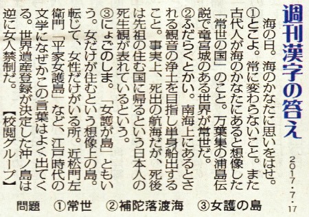 今日は月曜日、毎日新聞の週刊漢字掲載日です。今日の漢字は、海の日にちなんだ漢字の読み方とその意味を答える問題です。