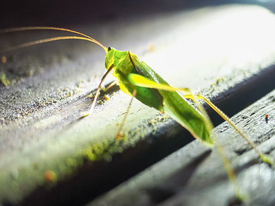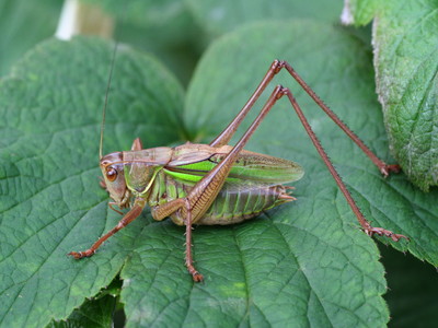 キリギリス:夏には昼も夜も「ギーチョン」という間延びした鳴き声が聞こえてきます。人の気配を感じると隠れてしまうので捕まえにくい。玉ねぎをぶら下げてキリギリスを釣る遊びが昔から知られています。 |