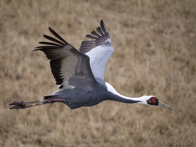 マナズル:冬になると北から飛来します。目の周りは赤く、白いほっかむりをしたような模様が印象的です。翼を広げると2mの大きさになります。 |