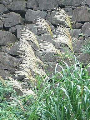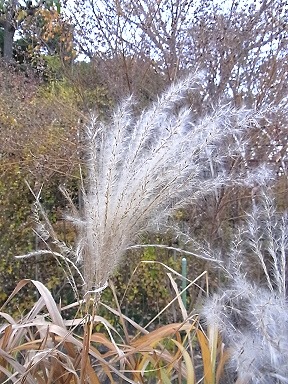 主な開花期は秋で、花茎を長く伸ばして、ふさふさした銀白色(ときには、ごく淡いピンク)の花穂を付けます。花穂の長さは70cm前後で、絹糸のような光沢のある毛が密生します。雄と雌の株があり、花穂は雌株のほうが長いとされます。