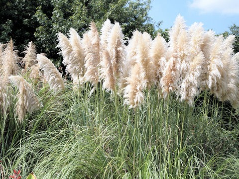 パンパスグラスとは、細かな歯が並ぶ葉の縁アルゼンチン~ブラジル南部にかけて分布する大型の多年草です。パンパと呼ばれる南米の草原地帯に自生しているのでこの名前があります。草丈は大きなもので3mに達します。ススキ〔Miscanthus sinensis〕を巨大かつワイルドにしたような花穂が見どころです。風に揺れる姿は雄大な中にも情緒があります。