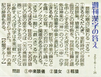今年は申年なので芸能関係で「さる」に関する漢字3題です。あまり馴染みの無い世界の漢字なので読み方や意味に戸惑うかもしれません。