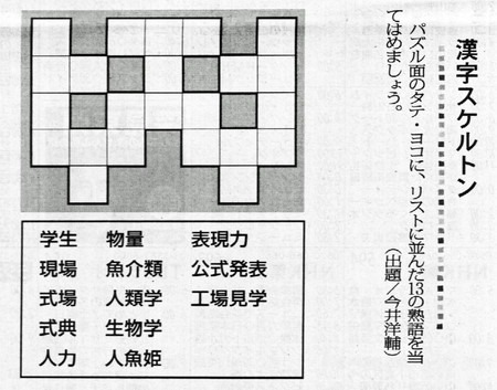 2017年9月2日 9月最初のパズルです カテゴリ: 頭の体操| 投稿時間: 07:31 小桃 おはようございます。9月に入りました。相変わらず変な天気が続きますね。もうすぐ秋です。暑さをもうしばらく我慢しましょうネ。 9月最初の土曜日、毎日新聞のパズル掲載日です。今日のパズルは、漢字スケルトンの問題です。問題をよく読んでチャレンジしてください。 問題や答えが小さくて読みずらいときは画像をクリックすると拡大表示されます。 答は画面左下の(さらに・・・)をクリックすると表示されます。 (さらに…)